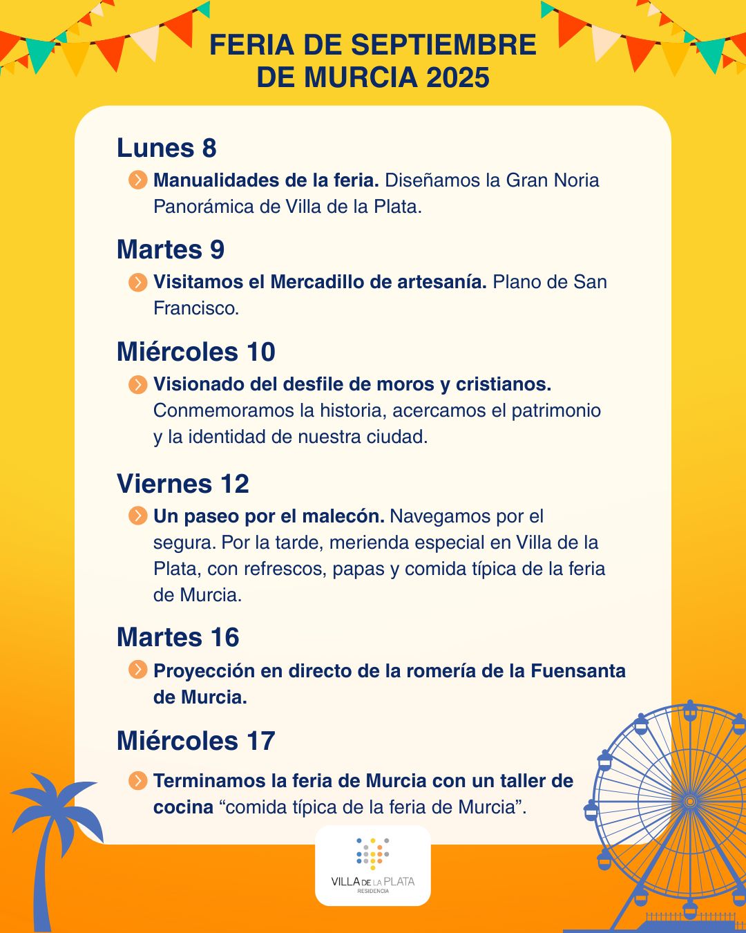 Os mostramos nuestro calendario de eventos para La Feria de Septiembre de Murcia de 2025, con los que podrán disfrutar nuestros residentes de Villa de la Plata.